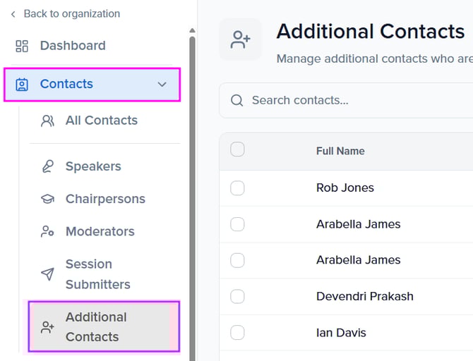 💡Tip: You can import up to three additional contacts when importing primary contacts (e.g., speakers). When using the system-generated import template, the following fields are available to create additional contacts during import: