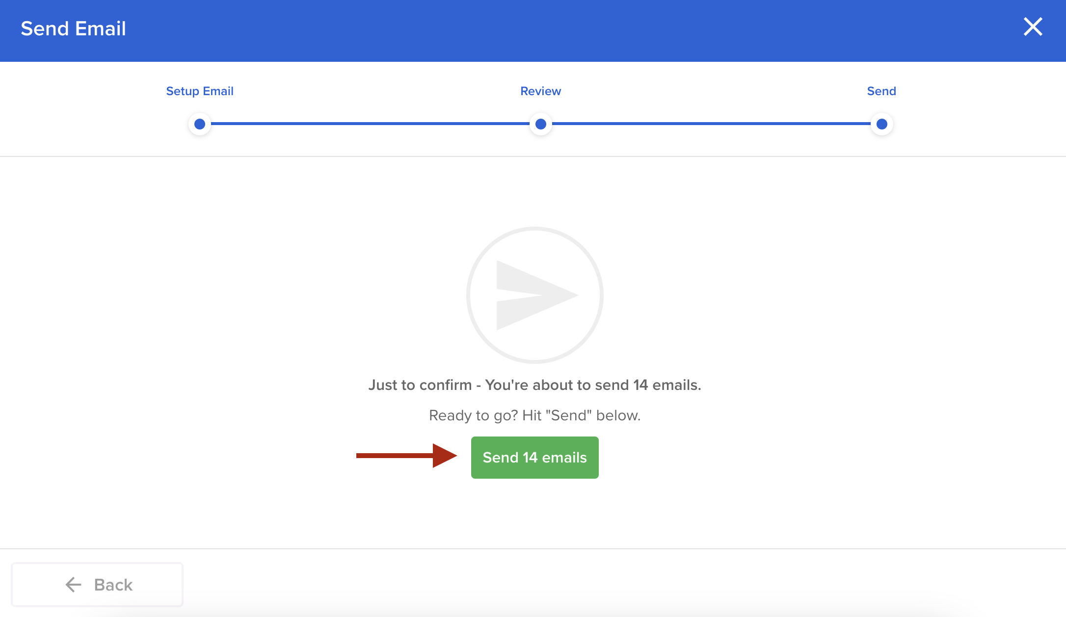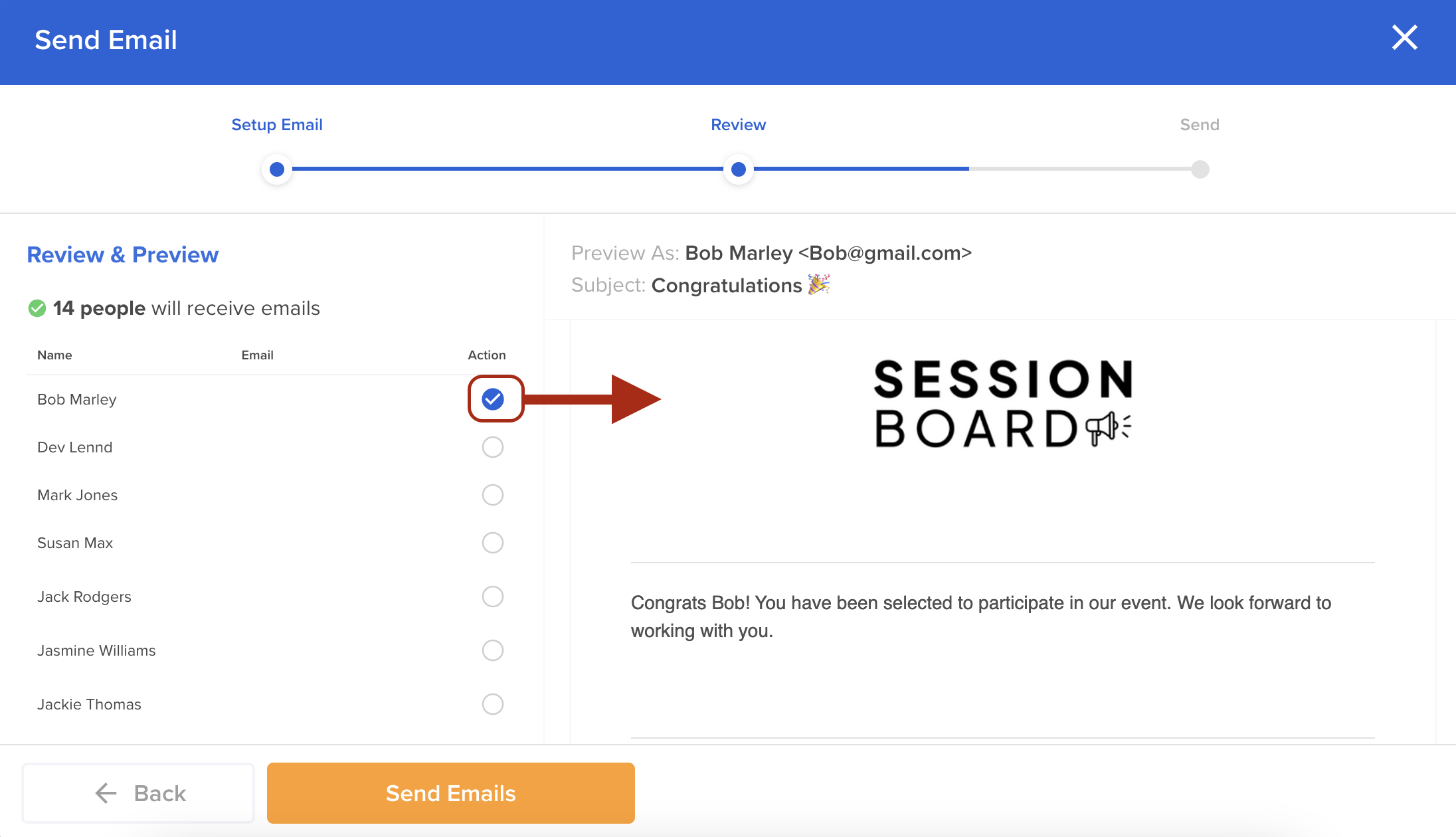 5. To send the emails, select the orange Send Emails button to confirm your action on the next screen.