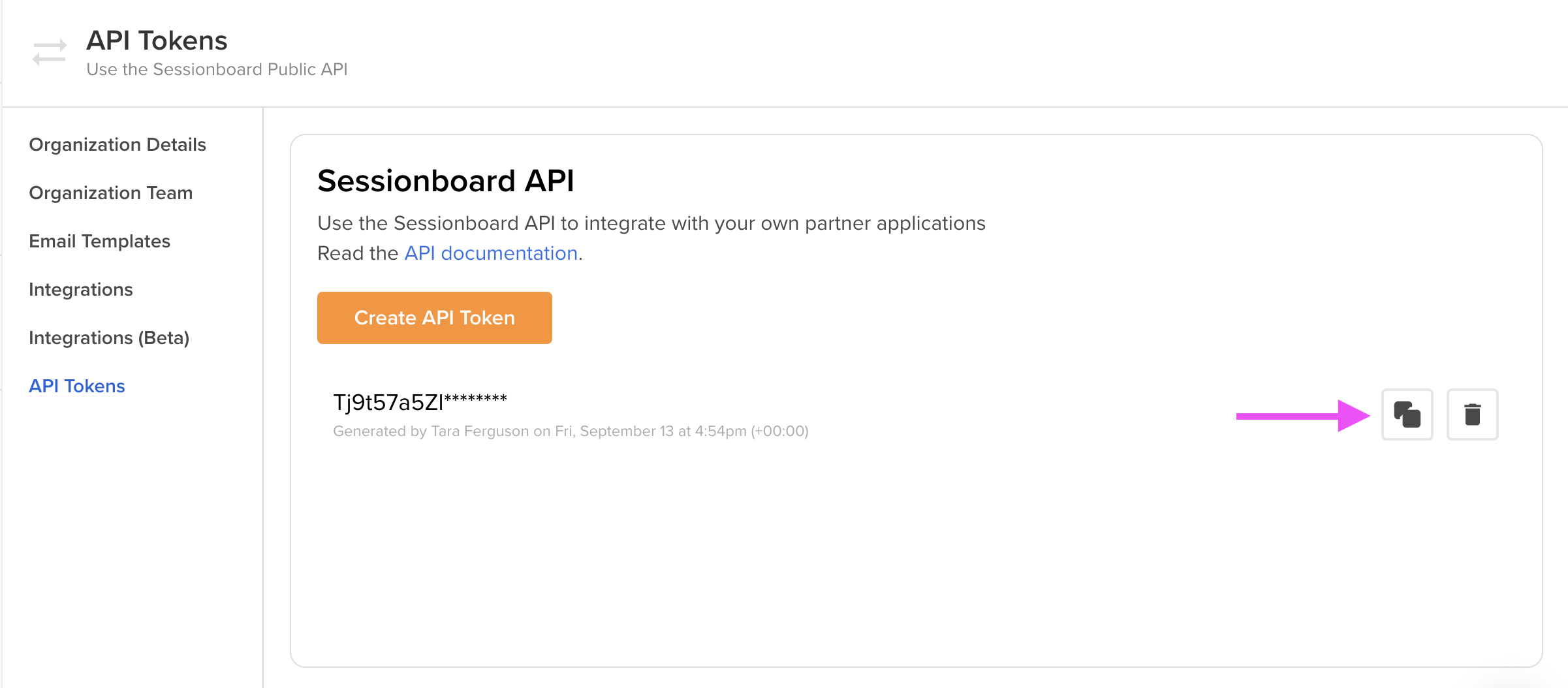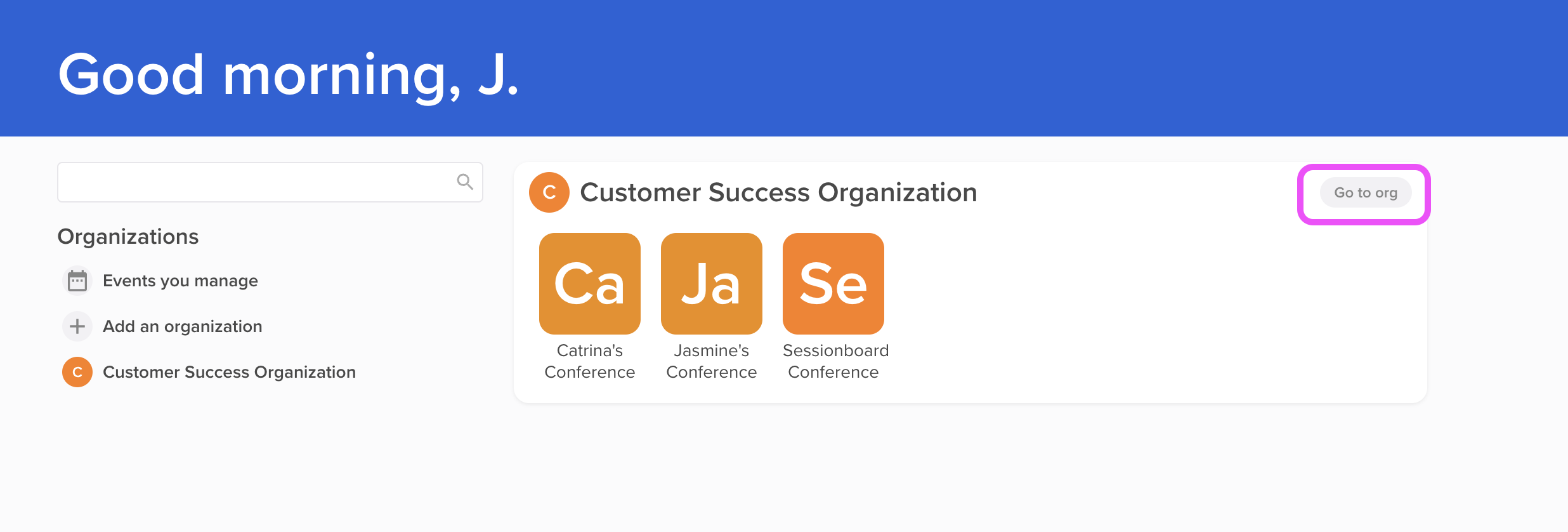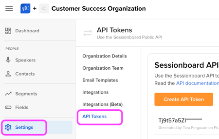 After logging into Sessionboard, select “Go to org” to access your event's organization.Select the 'Settings' module to locate 'API Tokens'