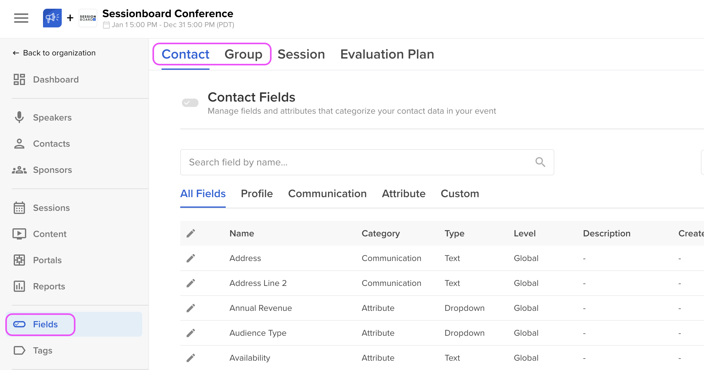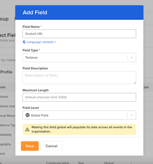 Within your event, navigate to the Fields module to create a field that will be used to display the links sent from Snöball.-