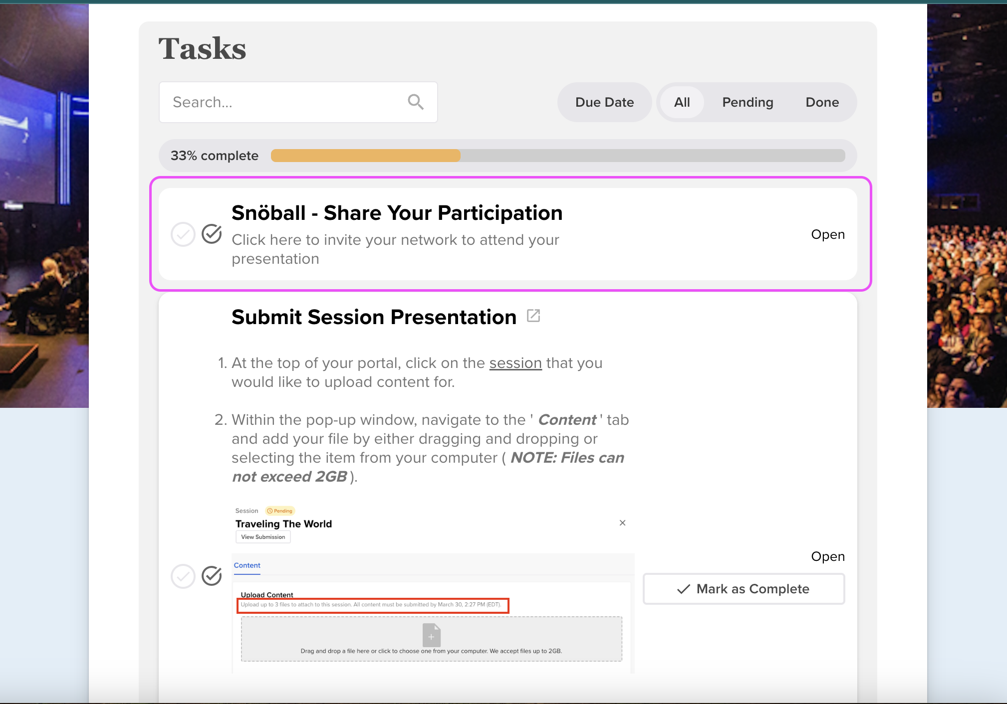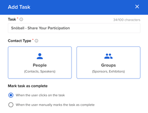 So that your event contacts can access the Snoball URL and share their participation with their community, event admins need to create a task that will be accessible to your event contacts (i.e. speakers & sponsors) within their portal.