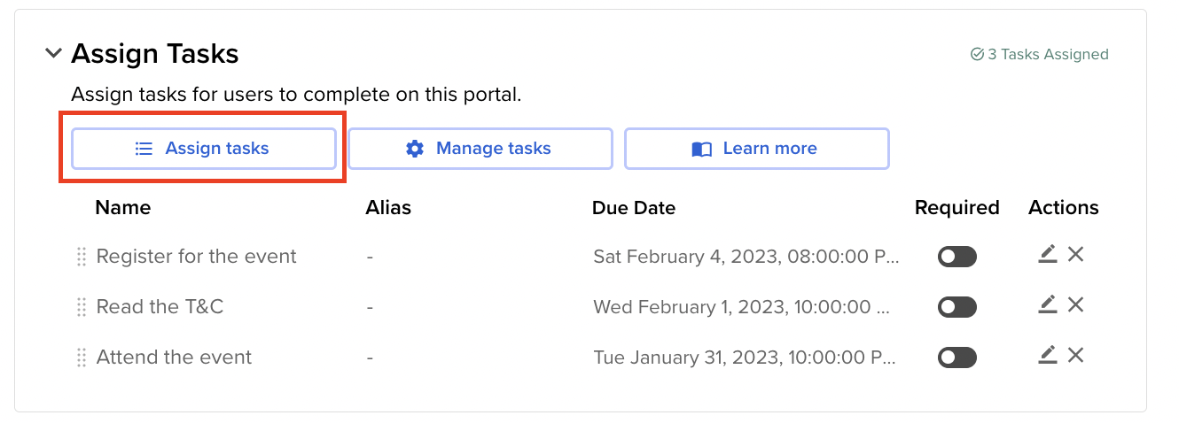 Required: Tasks can be marked as required by toggling this button on. This action can also be done from the portal main menu.