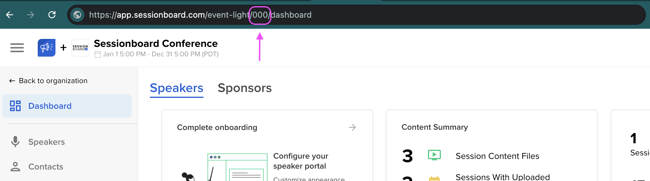 Within the page address bar, locate the 2-4 digit number within the event URL that proceedshttps://app.sessionboard.com/event-light/
