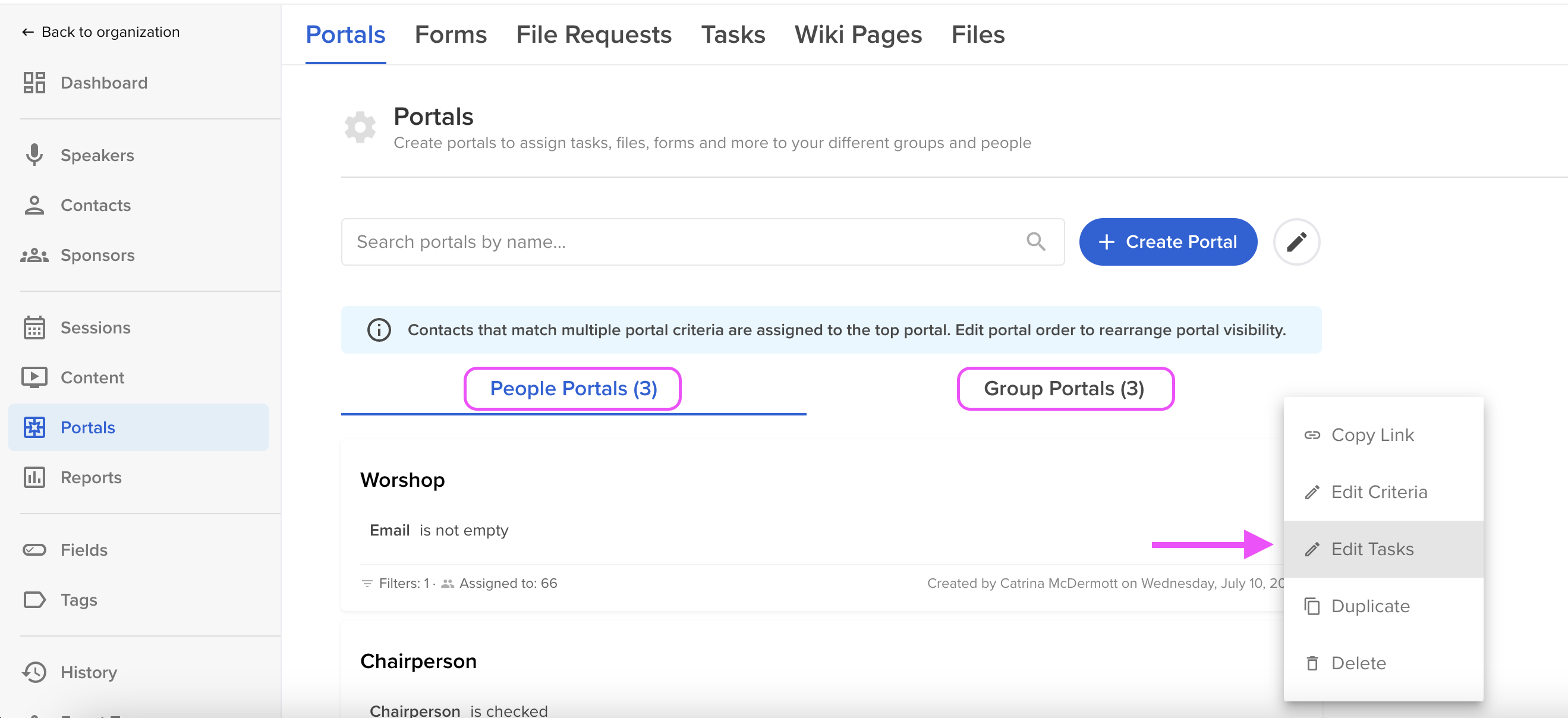 Within the Portals module, select the three ellipse dots to the right of the portal you would like to assign the task to and select Edit Tasks.