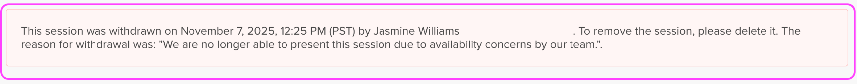 By selecting the pencil icon to the left of a session, the top of the page will display a message stating who withdrew the session and for what reason.
