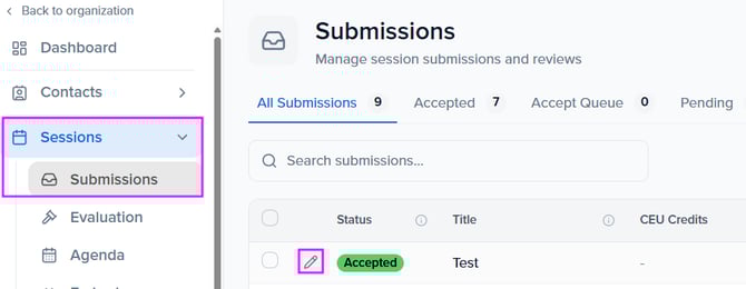 Within Sessions > Submissions (or Agenda), select the pencil icon to the left of a session to view the session profile.