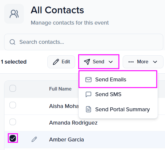At this time, emails can only be sent to users listed within your event’s Contacts module.