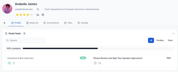 When viewing a contact’s profile in Sessionboard as an event organizer or if the contact is viewing the event portal, you will see every session that person is linked to. This includes sessions that are accepted, declined, or pending.