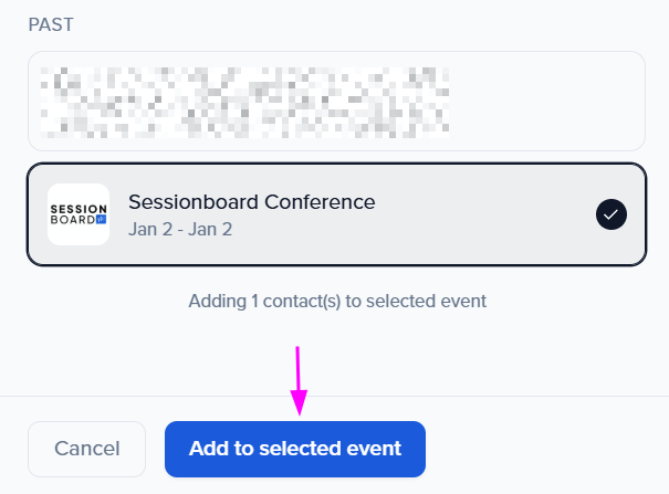 - Within the pop-up modal, select the event you wish to assign the contact(s) to and click the orange add to event button.