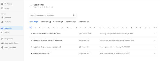 Using the search bar, team members can conduct a simple search for contacts and/or speakers using key terms that relate to a field (i.e. Contact Name, Company Name, or Job Title).