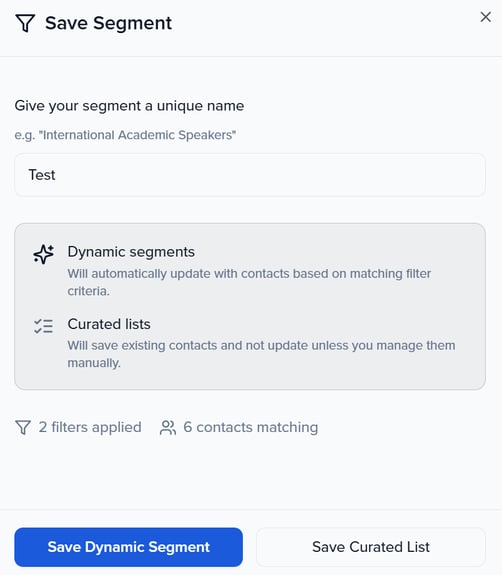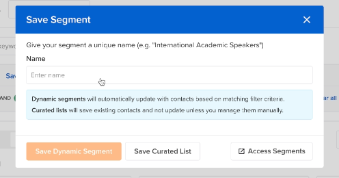 A pop-up window will appear asking you to name the segment as well as identify if this segment is dynamic or a curated list.