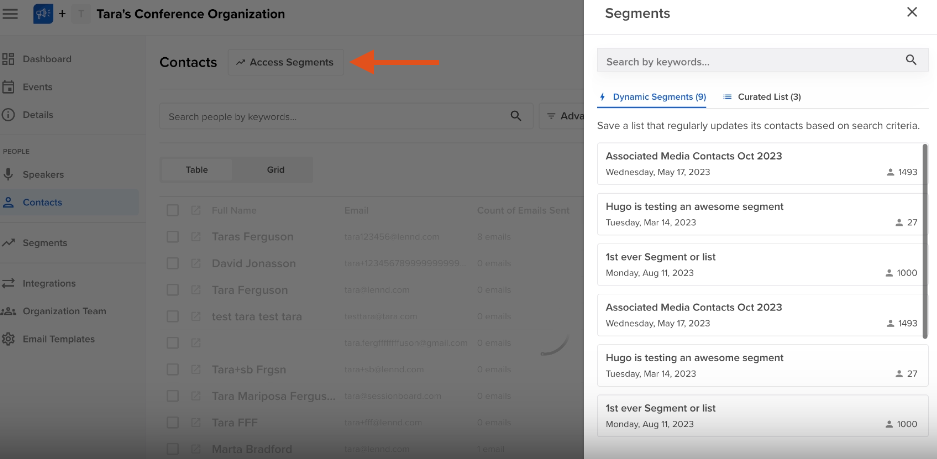 Within 'Contacts' or 'Speakers' select the button 'Access Segments' at the top of the page. This will open a flyout bar that will allow users to search for segments based on keywords typed within the search bar. In addition, you will be able to see when the segment was created as well as how many contacts are within the segment.