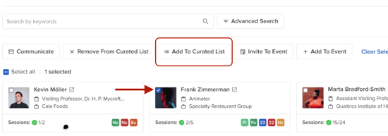 From 'Contacts' or 'Speakers', search and select the contact you would like to add to a curated list by clicking the white square in the top left-hand corner of their contact image.
