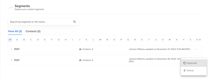 In the left navigation panel, select 'Segments'. Segments can be filtered by contact type (i.e. speaker vs. contact) and alphabetically by segment name.