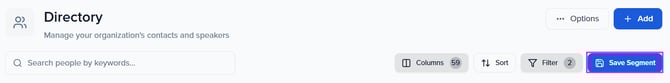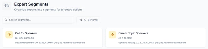Segments can be filtered by contact type (i.e. speaker vs. contact) and alphabetically by segment name.