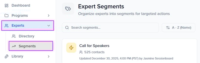 Within 'Experts' select the button 'Segments'. This will open a flyout bar that will allow users to search for segments based on keywords typed within the search bar. In addition, you will be able to see when the segment was created as well as how many contacts are within the segment.