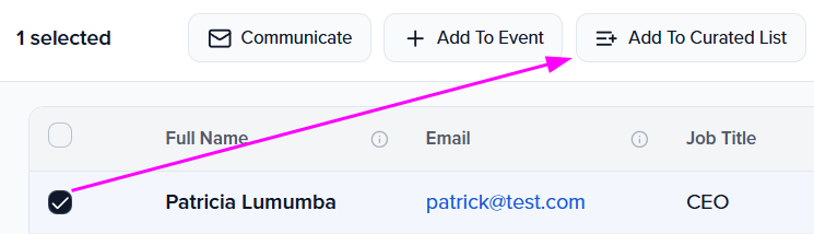 From 'Contacts', search and select the contact you would like to add to a curated list by clicking the white square in the top left-hand corner of their contact image.