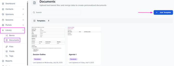 From your left-hand menu, access the Library module to open the dropdown, and select Documents. Tap the + Add Template button on the right-hand side to start a new document.