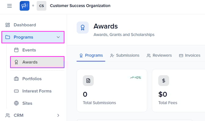 The Awards hub also includes global tabs across the top — Programs, Submissions, Reviewers, and Invoices — so you can manage operations across all programs without opening each one individually.