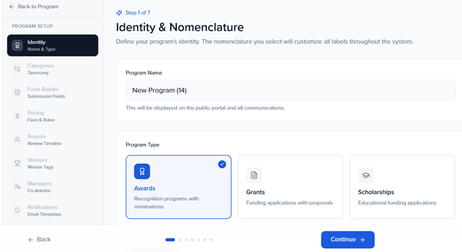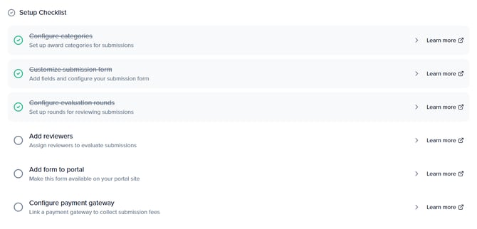 Note: Programs start in Draft status after the wizard completes. Before opening your program to submissions, make sure your form, pricing, notifications, and site are fully configured. Use the Setup Checklist on your Program Dashboard to track progress.