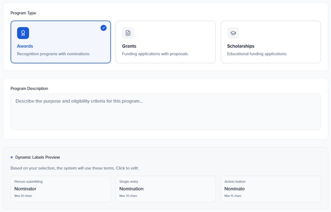 Tip: You can run multiple awards programs simultaneously from the same organization. Each program has its own form, categories, pricing, reviewers, and notifications — so you can manage an annual awards program and a separate grants program side by side.