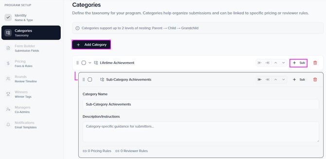 Note: Each category shows a count of linked Pricing Rules and Reviewer Rules at the bottom. These links are configured in the Pricing and Rounds steps respectively — but thinking through your category structure now will make those steps easier.