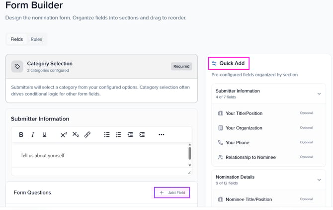 - Standard fields — A Quick Add panel on the right provides pre-built fields (Nominee First Name, Last Name, Email, Title/Position, Organization, Department, Phone, Nomination Statement, Impact & Achievements, Supporting Documents, CV/Resume, Website/Portfolio). Required fields are flagged if missing.