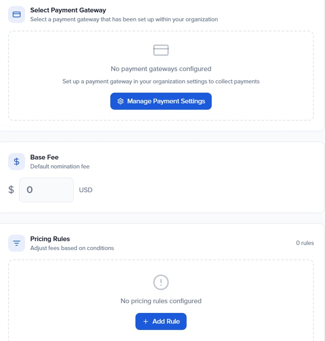 If your program charges a fee for submissions, this is where you configure it. Pricing is covered in detail in Awards Pricing, Payments & Invoices, but the wizard step includes: