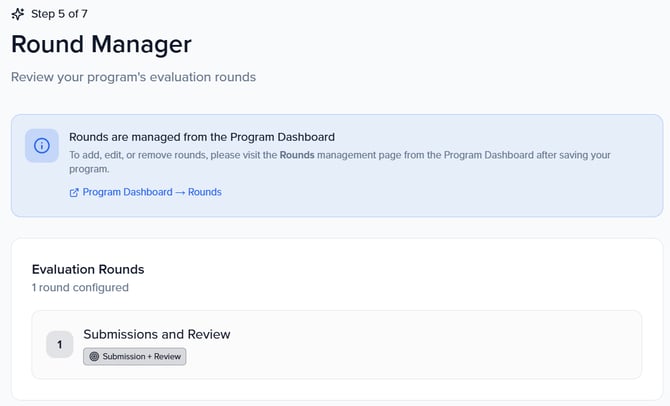 Rounds define the evaluation timeline for your program. A default round called "Submissions and Review" is created automatically. This step in the wizard shows your configured rounds, but detailed round management happens from the Program Dashboard after saving.