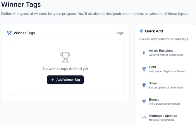 Winner Tags let you define the types of recognition your program will award. After reviews are complete, you will use these tags to designate submissions as winners.