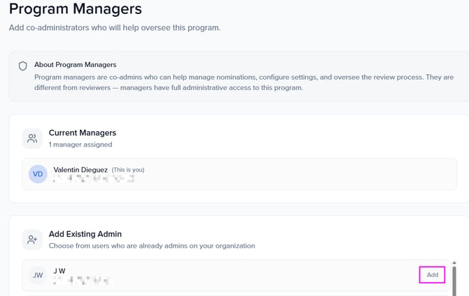Program Managers are co-administrators who help maintain your program. Unlike reviewers (who evaluate submissions), managers have full administrative access to the program — including managing submissions, configuring settings, and overseeing the review process.