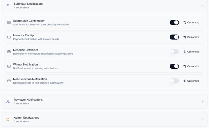 - Submitter Notifications — Submission Confirmation, Invoice / Receipt, Deadline Reminder, Winner Notification, Non-Selection Notification