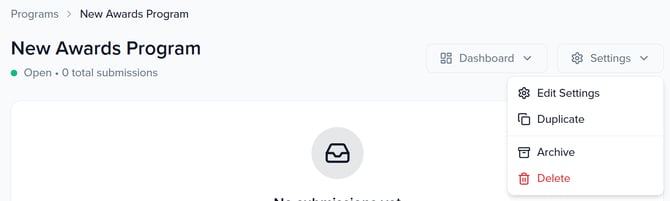 - Archive — Mark the program as archived. Data is preserved but no new submissions are accepted.
