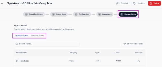 For both the Session and Contact sections, use the Show/Hide Fields button to control which fields are visible or hidden.