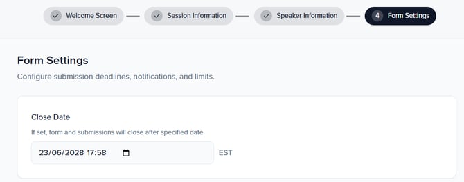 If you prefer more control over how new speakers are added, you can build a session portal form specifically for collecting additional speaker details. Unlike reopening the submission form, this method routes new information to the admin team for review before adding speakers to a session.