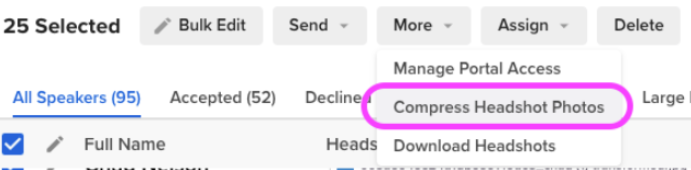 Navigate to the Contacts or Speakers module and select the contacts you wish to compress headshots for using the checkbox to the left of the contact record. At the top of your page, select More > Compress Headshot Photos.