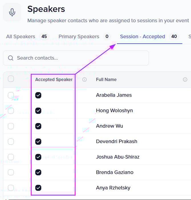 - For each accepted speaker, check the box to identify them as an accepted speaker.