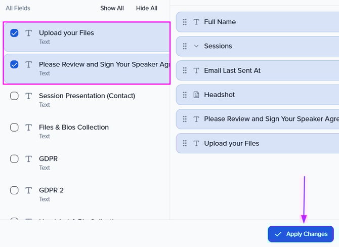 On the Columns tab, select the checkbox next to any reporting fields you want to add to your view & Apply Changes.