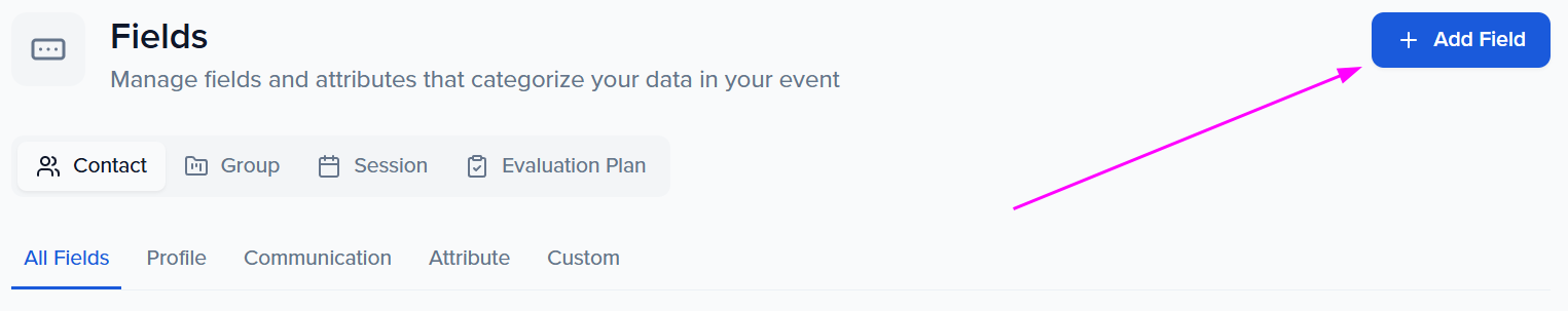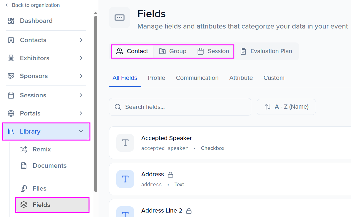 Within the Library > Fields module, select the appropriate field type at the top of the page based on the type of field you want to create: Contact, Group, or Session.