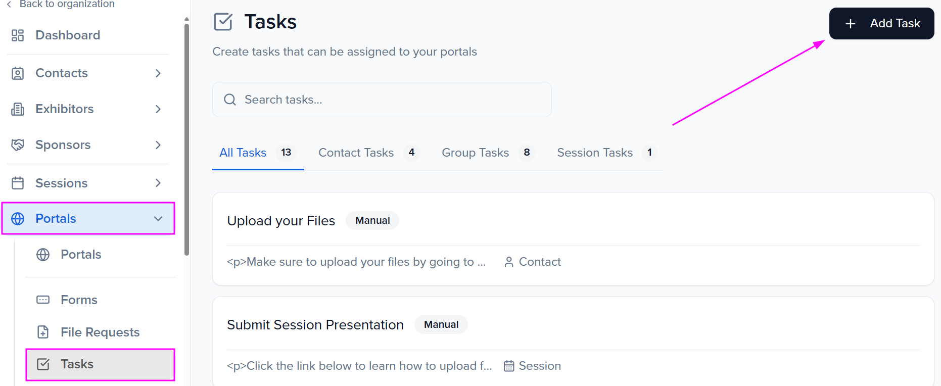 Navigate to Portals > Tasks and select the +Add Task button on the right-hand side of your page.