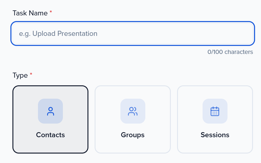 After creating a custom field or identifying the standard field you’d like to use, be sure to update all relevant records (e.g., contacts, sessions, or groups) with the information you want to display in the task description or as the task link using that field. You can do this manually or via import.